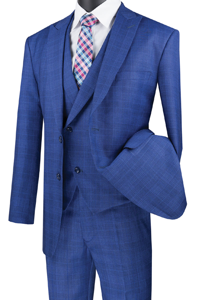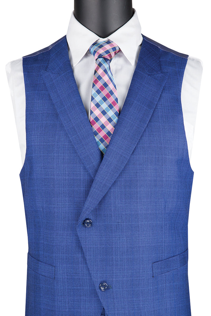 Mens 2 Button Peak Lapel Double Breasted Vest Plaid Windowpane Suit in Blue